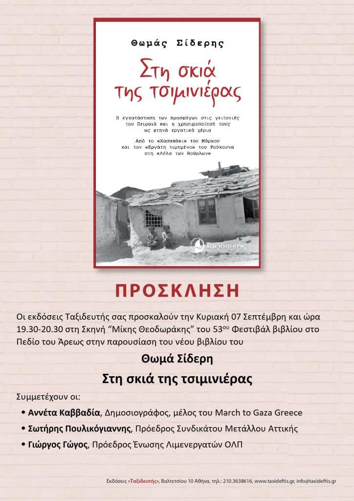 Ο συγγραφέας του βιβλίου μεγάλωσε, όπως και χιλιάδες άλλα παιδιά, στη Σκιά μιας Τσιμινιέρας. Το βιβλίο εστιάζει στο εργατικό δυναμικό στις προσφυγικές γειτονιές της περιφέρειας του Πειραιά, αλλά η ίδια συνθήκη υπάρχει όπου εγκαταστάθηκαν πρόσφυγες και περιπλανώμενο εργατικό δυναμικό: στη Θεσσαλονίκη, τον Βόλο, την Πάτρα και αλλού.